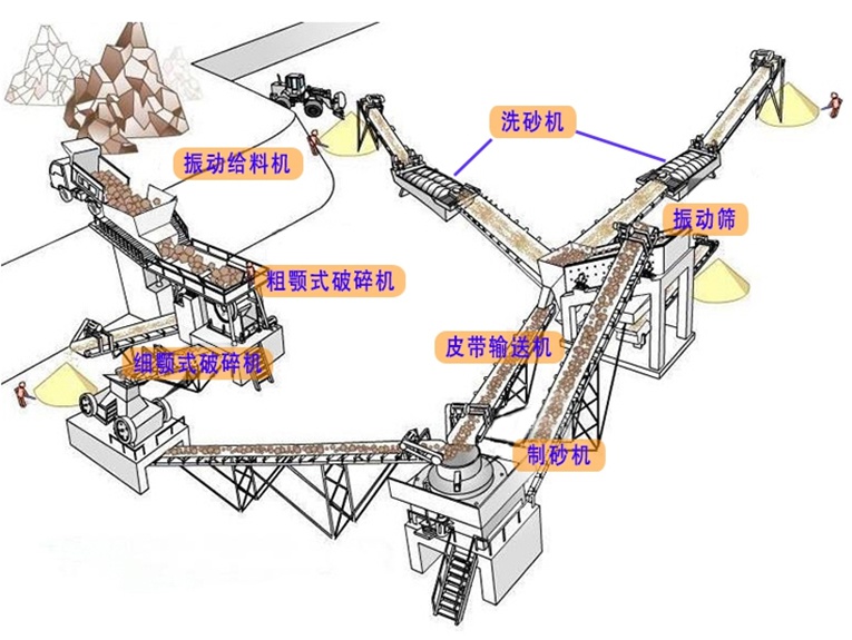 石料通過振動給料機(jī)均勻進(jìn)入粗顎式破碎機(jī)進(jìn)行初步破碎,產(chǎn)成的粗料由輸送機(jī)輸送至細(xì)碎機(jī)(可選配重型制砂機(jī)或立軸制砂機(jī))進(jìn)行進(jìn)第二步破碎,細(xì)碎后的石料進(jìn)振動篩篩分出各種規(guī)格的沙子、石子;然后進(jìn)入振動篩進(jìn)行篩分,滿足客戶要求的通過輸送機(jī)輸送至成品料區(qū),不滿足要求的重新進(jìn)入制砂機(jī)再次破碎,終產(chǎn)出符合要求的各種砂料(人工沙生產(chǎn)線)。