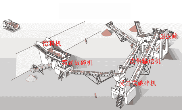 石料生產(chǎn)線的生產(chǎn)流程大致為:(料倉)->振動(dòng)給料機(jī)->顎式破碎機(jī)->反擊式破碎機(jī)->振動(dòng)篩->(成品石料),各設(shè)備中間以溜槽或皮帶輸送機(jī)相連。