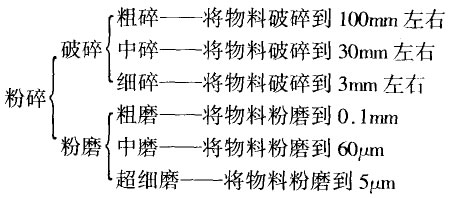 將固體物料破碎的力法有多種,通常采用機(jī)械方法,如顎式破碎機(jī)、反擊式破碎機(jī)、第三代制砂機(jī)等,物料的破碎作業(yè)一般是在破碎機(jī)和粉磨機(jī)內(nèi)進(jìn)行的,所以按物料破碎的粗細(xì)程度,又劃分為破碎和粉磨兩個過程,如下圖: